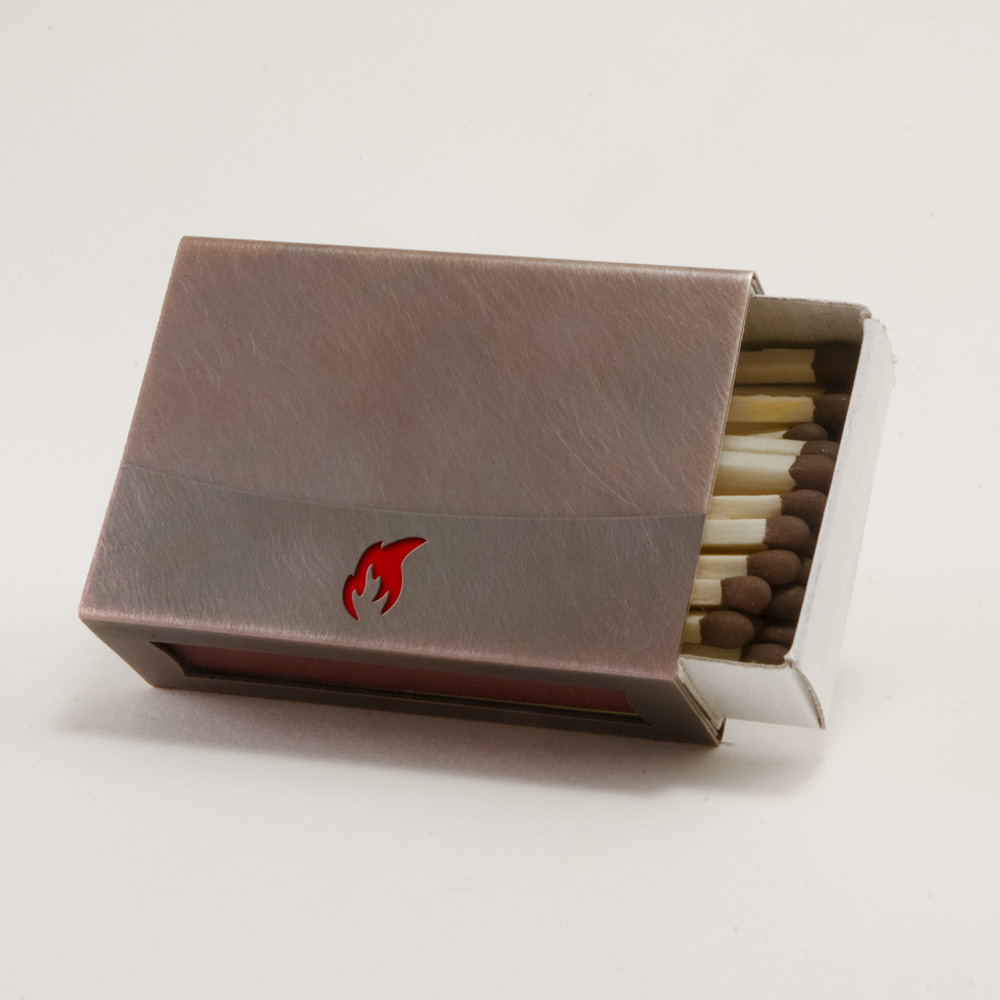 Streichholzschachtel-Hülle mit Flamme aus Kupfer